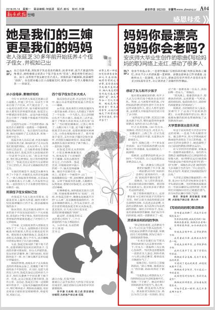 皖江晚报:《写给妈妈的歌》刷屏朋友圈 http://epaper2.wjol.net.cn/wjwb/html/2018-05/14/content_212753.htm?div=-1