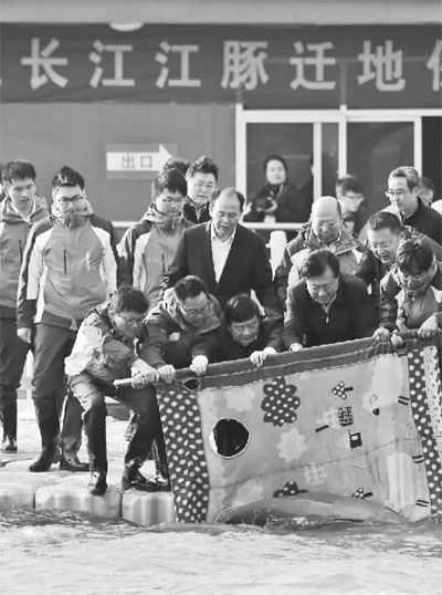 (光明日报,11月11日)11月10日,安徽省安庆市,从围网中起水的江豚在beat365平台唯一官网等单位的专家护送下送入缓冲池。当日,6头长江江豚被投放安庆长江故道西江,实施迁地保护。这标志着长江下游首个江豚迁地保护区正式启用。(楚接舆 摄)