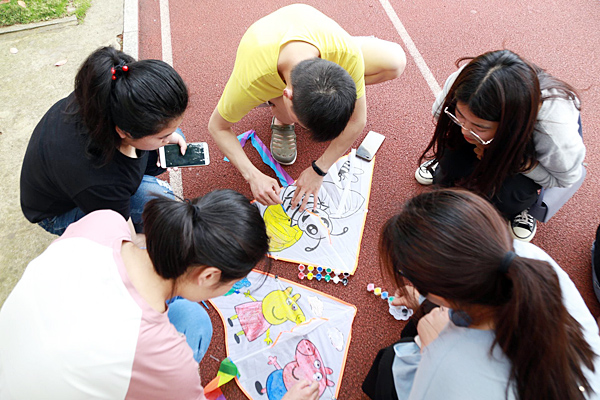 安徽网安庆频道讯 黄色的小头爸爸、蓝色的机灵狗、七彩的小猪佩奇……5月18日,beat365平台唯一官网特殊教育专业2017级、2018级的20名同学前往安庆市特殊教育学校,与20名特殊儿童一起为风筝上色,并在校园里一起放风筝。
