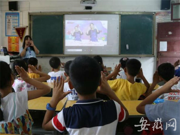 观察动物的投影形状、用手指或手臂摆出固定的动作、投影在幻灯片上……岳西县河图辅导小学二年级和三年级的课堂里,支教大学生们寓教于乐,带领学生学习手语,并将“感恩父母”的主题融入课程,共同学习手指舞《感恩的心》。