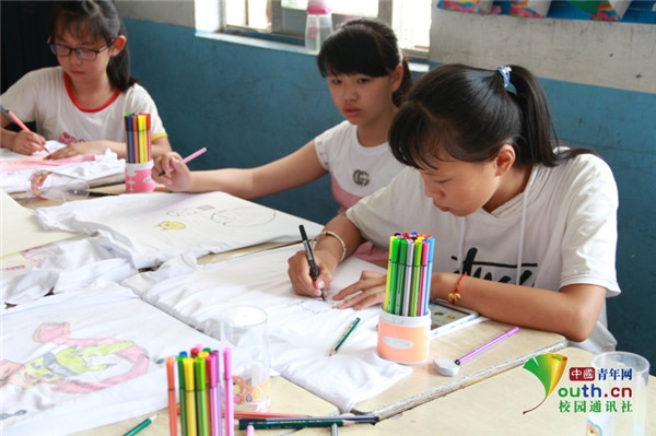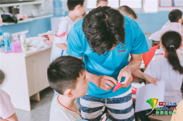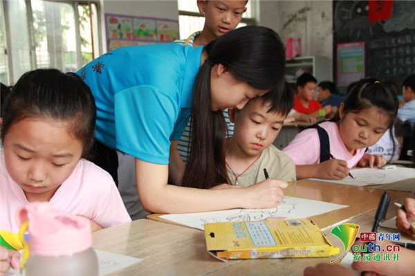 图为志愿服务团成员在指导孩子画漫画。 中国青年网通讯员 牛玉洁 摄