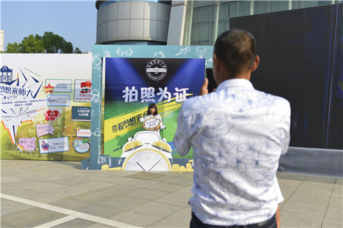 这里是“照片直播:带着梦想来师大”场景区,学生和家长可以拿着墙上的卡牌进行拍照留念,随后照片将实时上传到大屏幕上进行照片直播。环境科学2019(1)班的陈景倩拿着印有“心之所向,素履以往”字样的卡牌拍照后激动地说:“展板上的话是我一直都很喜欢的一句话,现在的我对大学生活充满憧憬。”