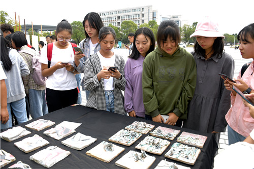 快闪结束后,“献礼新中国70华诞作品展”在广场上展出。现场展出的陶艺、剪纸、书法等不同种类的五十余件作品,均来自安庆师大各艺术俱乐部学生的手工制作。中国地图的剪纸作品、赞美祖国河山的书法作品、形态各异的陶艺作品……引得不少学生驻足观看。