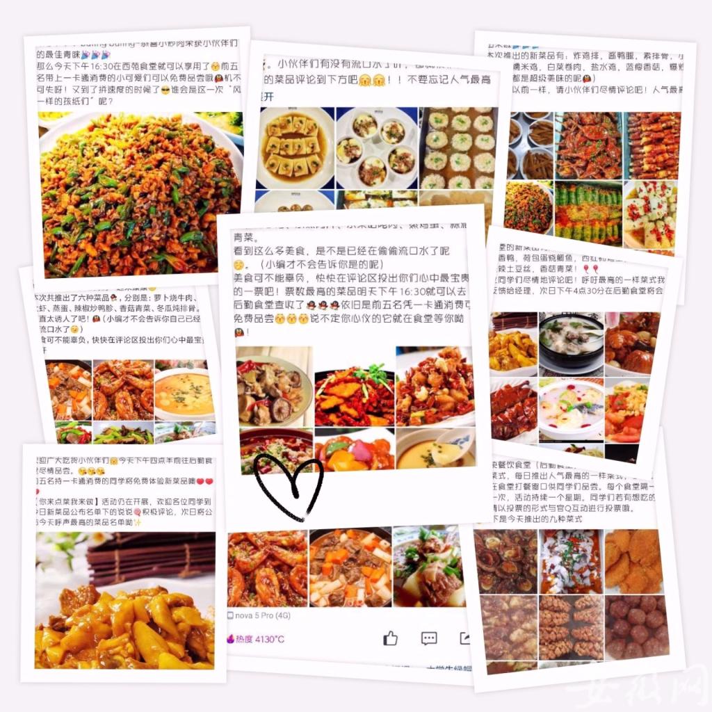 这是该校学生会和食堂联合推出的“你来点餐我来做”活动。在一周时间内,每天在学生会官Q上推出九道平时在食堂很难吃到的菜品,学生们在下方投票评论自己最想吃的一道菜,食堂就会在第二天的中餐或晚餐推出,前五名同学还可持校园卡免单。