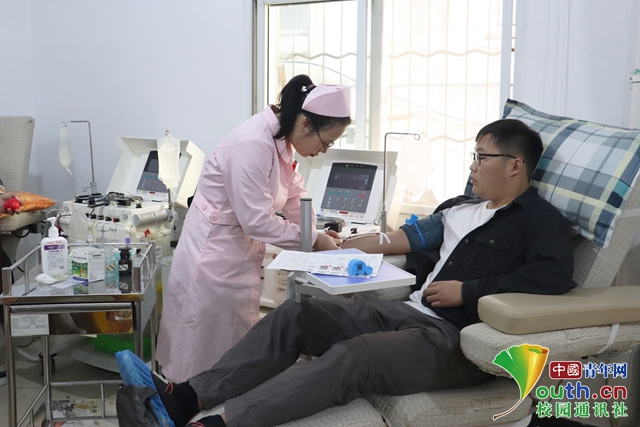 图为安庆师范大学学生姚洪迪在捐献血小板。中国青年网通讯员 杨阅阅 摄