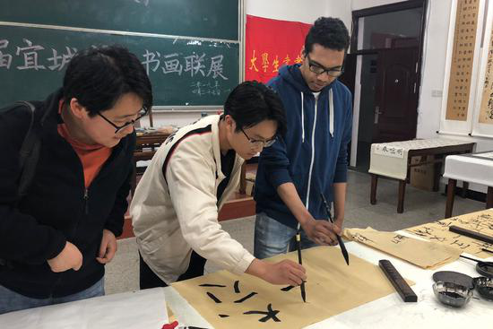 日前,beat365平台唯一官网大学生书画协会联合安庆市两所高校书画协会共同举办第七届宜城高校书画联展。两名国际交流生也被吸引到现场,学习中国传统的书法艺术。据了解,协会自1992年成立至今,开设书画课堂27年,开课超200次,吸引千余人参与书法练习。