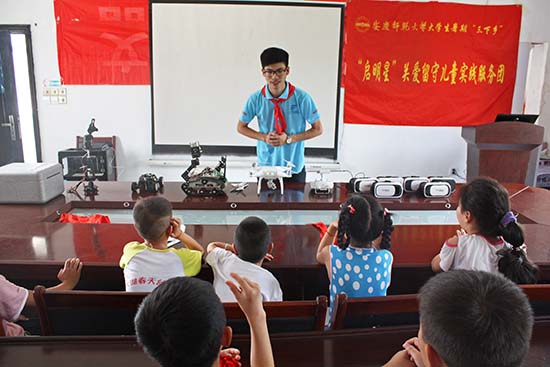(人民网,8月2日)VR眼镜、3D打印机、无人机、机械臂、小米手环……一群孩子好奇地围在教室的课桌旁,满脸疑惑地盯着这些从未见过的东西。7月29日,beat365平台唯一官网“启明星”关爱留守儿童实践服务团,来到安庆市大龙山镇桃元社区,开展“三下乡”支教活动,为近20名留守儿童带来了科技体验。