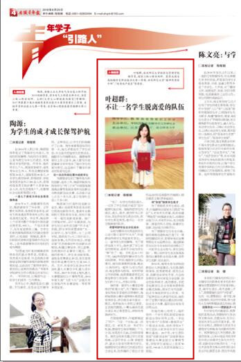 “为了一切学生的成长成人,一切为了学生的成才成功”是叶超群的座右铭。她始终把学生的成长、成人、成才、成功作为工作目标,坚信所有学生都会闪光、所有学生都是典型,绝不让一名学生脱离爱的队伍。