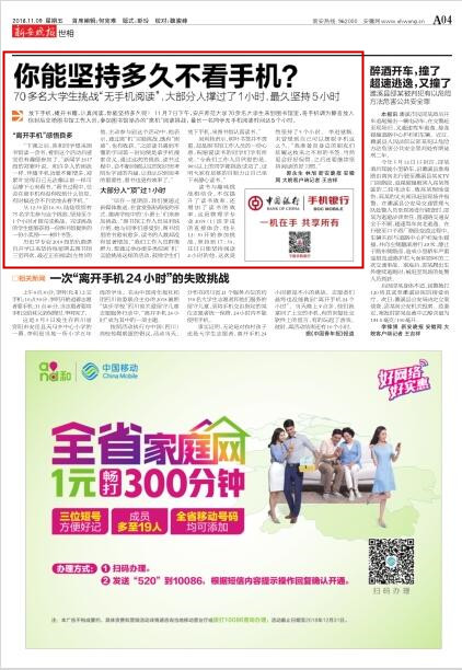 新安晚报:我省一高校70多名大学生挑战无手机阅读 http://epaper.ahwang.cn/xawb/20181109/html/page_03_content_000.htm