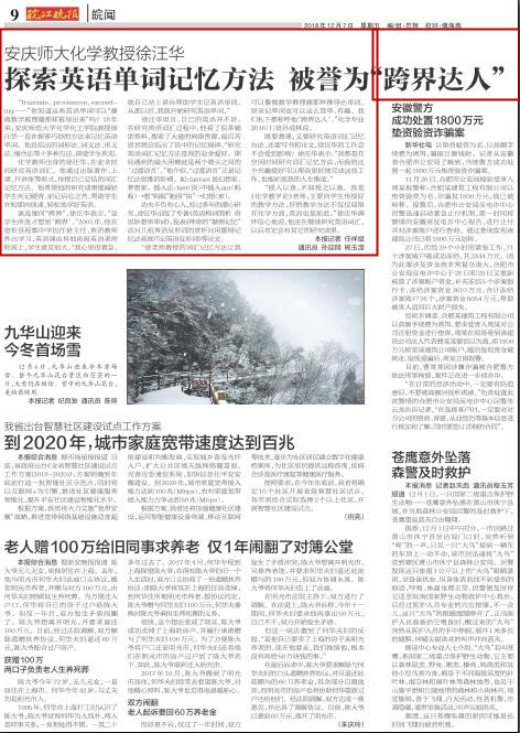 从那以后,我就开始研究英语单词。”徐汪华坦言,自己的英语并不好。在研究英语词汇过程中,他看了很多辅助资料,搜索了大量的网络资源,最后苦思冥想总结出了其中的记忆规律。“研究英语词汇记忆方法是我的业余爱好。期间遇到的最大困难就是两个箭头之间的‘过渡语言’。”他介绍,“过渡语言”正是记忆法思维的阶梯。如:fantast是幻想家、梦想家。插入法:fast(快)中插入ant(蚂蚁)→想“蚂蚁”跑得“快”→幻想(家)。功夫不负有心人,经过多年的潜心研究,徐汪华出版了专著《英语构词简析 奇思妙想串单词》,发表《神奇的“颠倒记忆”法》《几组英语反形词的赏析》《用颠倒记忆法高效巧记英语反形词》等论文。
