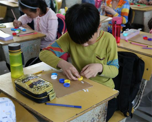 “同学们知道老师手里拿的是什么东西吗?对,是饮料瓶盖……”桃元小学四年级的教室里,协会成员将瓶盖分发给学生们,活动负责人刘永立介绍,活动将带领学生利用废弃瓶盖、易拉罐或落叶,手工制作成优美的工艺作品、绘画作品,通过对资源的再次运用,变废为宝,传达环保理念。