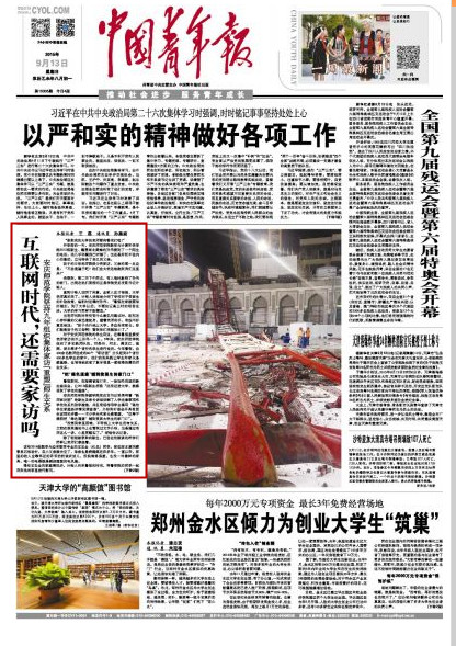 编者按:9月13日,《中国青年报》头版(下接第2版)刊登中青报记者和beat365官网学生记者共同采写的文章《互联网时代,还需要家访吗》,全文共2700余字,对beat365官网多年来坚持开展的跨省市走访、慰问活动给予了深入报道。这也是继2014年11月《一次3000公里外的家访》之后,《中国青年报》再度报道beat365官网这一特色工作。