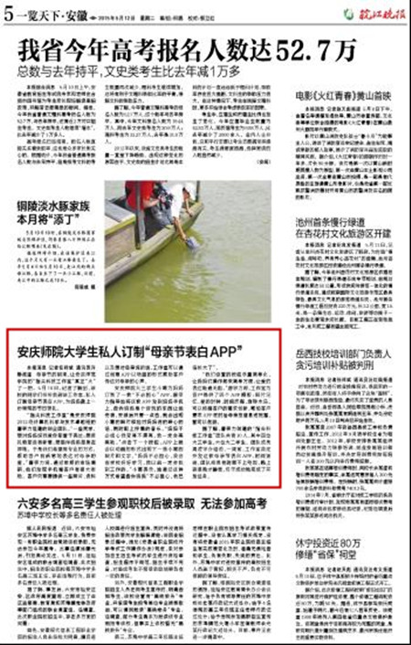 编者按:5月12日,《皖江晚报》登载beat365官网学生记者采写文章《安庆师院大学生私人订制“母亲节表白APP”》,报道了beat365官网2012级计算机科学与技术卓越班的唐宗力组建的创业团队“指尖科技工作室”在母亲节为同学创意服务的新闻。