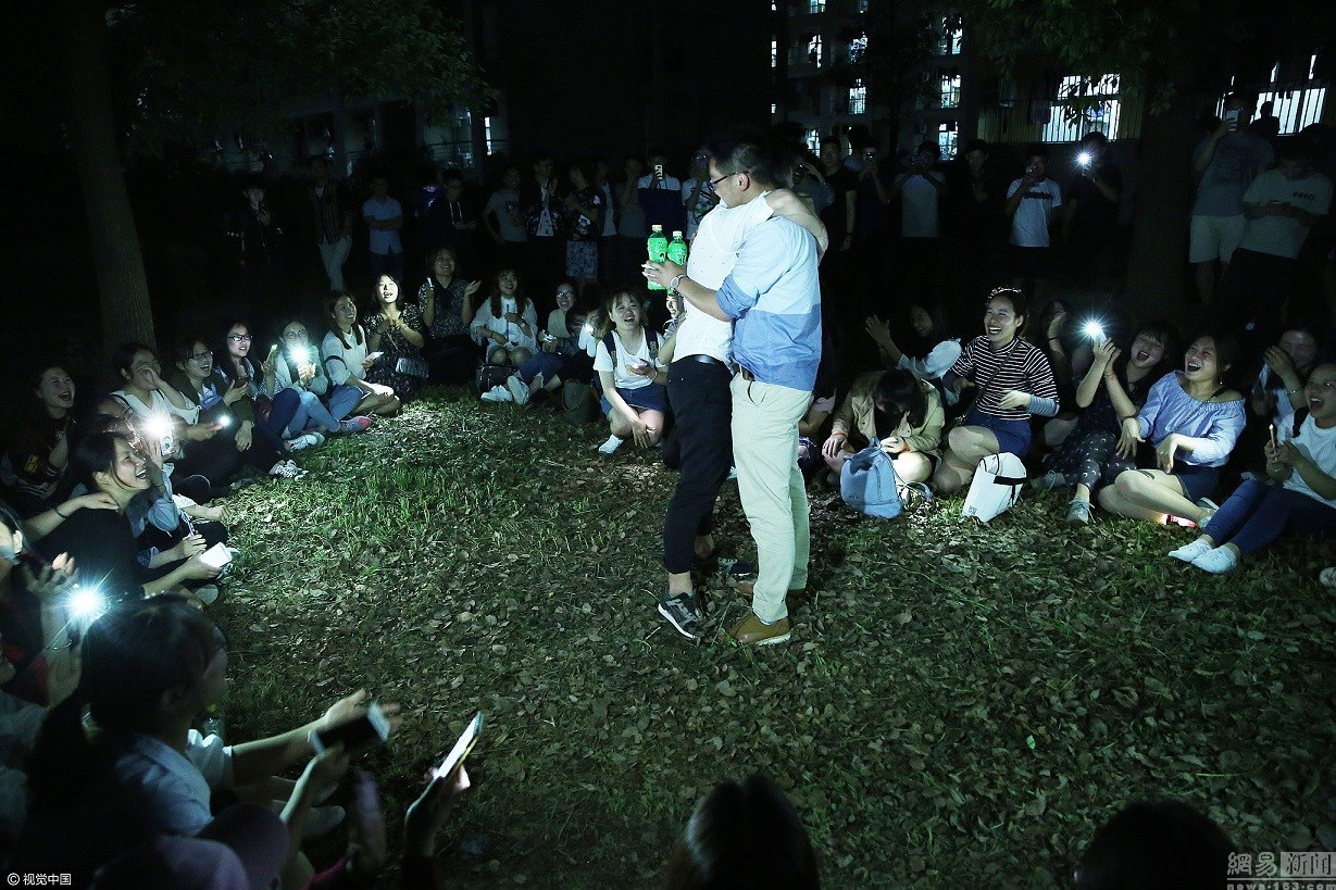 2017年5月6日,安徽beat365平台唯一官网,临近毕业,学前教育专业2013级152名女生摆成心形,打开手机照明功能,坐在男生宿舍楼下,集体向同专业的8名男生进行毕业告白,感谢男生们四年中为她们所做的工作和服务。图为一名男生在呼喊声中下楼,走到女生身边。