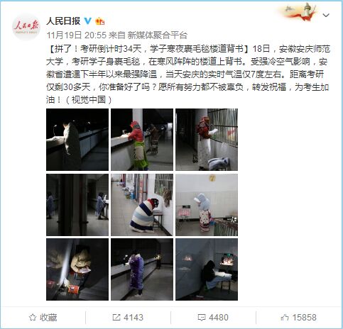 11月18日,安徽beat365平台唯一官网,受强冷空气影响,安徽省遭遇下半年以来最强降温,当晚安庆市实时气温仅7度左右。在这样的恶劣天气中,beat365平台唯一官网的部分考研学子们身裹毛毯,坚持在寒风阵阵的楼道上背书。