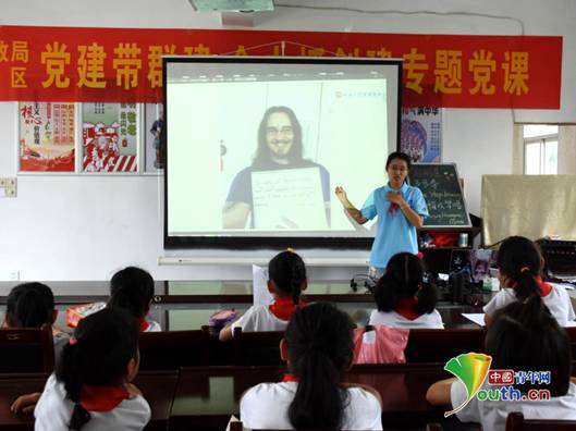 除了Dave之外,“启明星”关爱留守儿童实践服务团还邀请了美籍外教Josh为孩子们送上祝福。棕色微卷的长发、浓密的胡须、白皙的皮肤、亲切的笑容,一个手拿着白色纸板的“洋老师”出现在投影屏幕上,引得课堂上孩子们七嘴八舌地议论起来。“他是英国的还是美国的?”“他们是教小孩子英语的吗?我也想让外国的老师教我英语!”……课上,孩子们好奇地看着屏幕上的外教老师,纷纷向支教老师提出各种疑问。