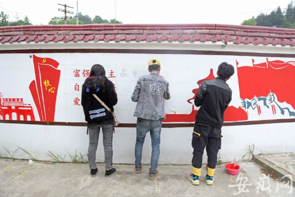 “我也来自山村,到这里来有一种亲切感,一想到这些画能给孩子们带来正能量、带来传统文化的熏陶,我就想早点完成,而且雨不是很大,墙绘不会被雨破坏。”环境设计专业2018级的农承忙表示,他参加过墙绘活动,但这样的义务墙绘还是第一次,他觉得这样的活动一方面可以让自己得到锻炼,另一方面能给孩子带去快乐,很有意义。