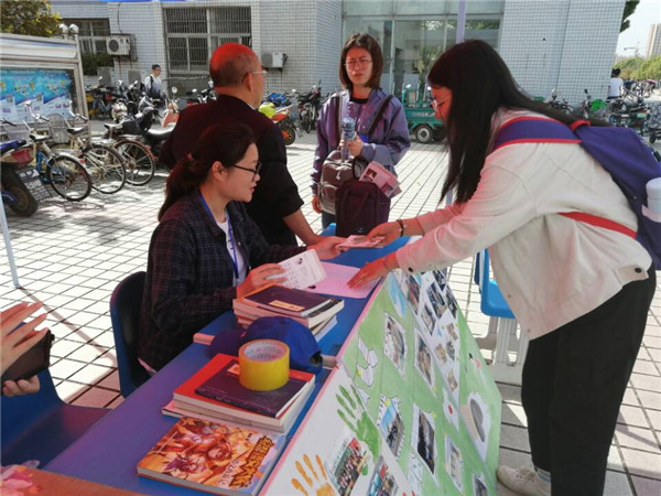 活动点有一位志愿者引人注意,她熟练地收书、发明信片、做介绍,动作迅速干练,她就是资源与环境学院环境工程专业2017(2)班的刘悦文。她已经是第二次参加捐书活动了。虽然已经不在志愿服务团工作,但是为了帮助更多孩子,也为了协助新成员办好此次活动,她在繁忙的学业中抽空来帮忙。