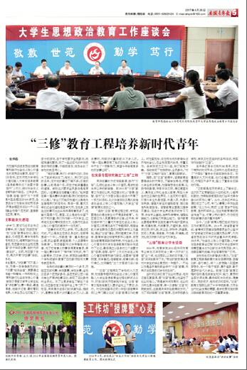 “‘三修’工程得到了学校的大力支持,校党委专题研究社会主义核心价值观融入大学生修身教育全过程创新试点工作,印发《安庆师范学院大学生‘三修’教育工程实施意见》,要求全校上下贯彻、执行。时任校党委书记何小祥在《安徽青年报》上专门撰文论述‘三修’教育工作的意义。时任副校长、现任校长闵永新牵头召开相关会议,在全校范围内动员、布置工作。各学院成立工作小组,制订实施方案。活动实现了校院联动,全员参与。”对于“三修”工程的“诞生”,夏靖如数家珍。