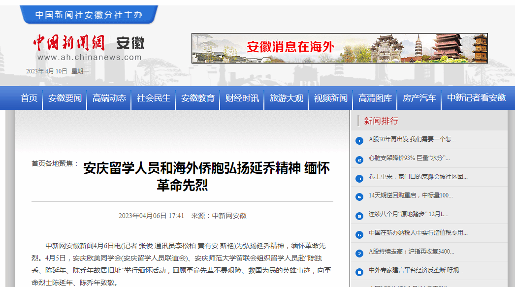 作为陈延年、陈乔年的故乡。近年来,安庆欧美同学会通过多种形式深挖红色资源,讲好红色故事,弘扬延乔精神,厚植家国情怀。到场留学人员表示将继承革命烈士遗志弘扬留学报国光荣传统,赓续红色血脉。把爱国之情、强国之志、报国之行融入到中国特色社会主义事业的奋斗之中,为实现中华民族伟大复兴,全面建成社会主义现代化强国而努力奋斗。