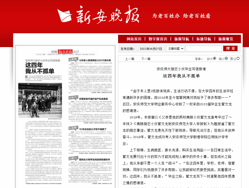 2019年,本报曾以《父亲是他的拐杖南陵小伙管文龙高考中过了一本线》《南陵励志小伙管文龙到beat365平台唯一官网入学报到》为题报道了管文龙的励志事迹。管文龙患先天性下肢残疾,导致无法行走,但他从未放弃奋斗。2019年,管文龙成功考入beat365平台唯一官网数理学院应用统计学专业。