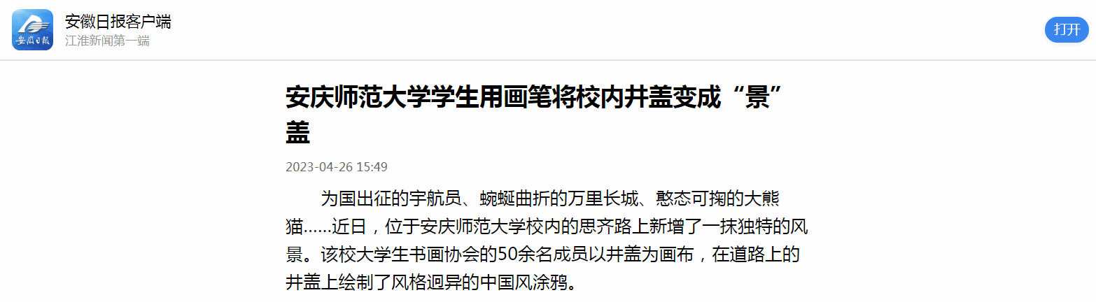 以安庆标志振风塔为基底、奔涌的浪花为边框、绿叶红花作点缀,新闻传播学类专业2022(2)班的马雨扬和同伴们合理分工,共同绘制出一幅江边古塔图。“我们将安庆市元素融入到了井盖画的绘制中,意在宣传地方特色文化。”她说。