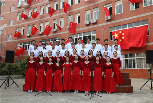 国歌奏毕,悠扬的《歌唱祖国》旋律缓缓响起,艺术楼2至5楼窗外40面3号国旗应声挥舞,迎风招展,蔚为壮观,合唱团的同学们和现场全体师生挥舞着手中的国旗,一起歌唱美丽的祖国。管乐团指挥老师表示,经过几十次的排练,才得到了这样完美的演出效果,这个过程既提升了同学们的学习能力,也陶冶了爱国情操。