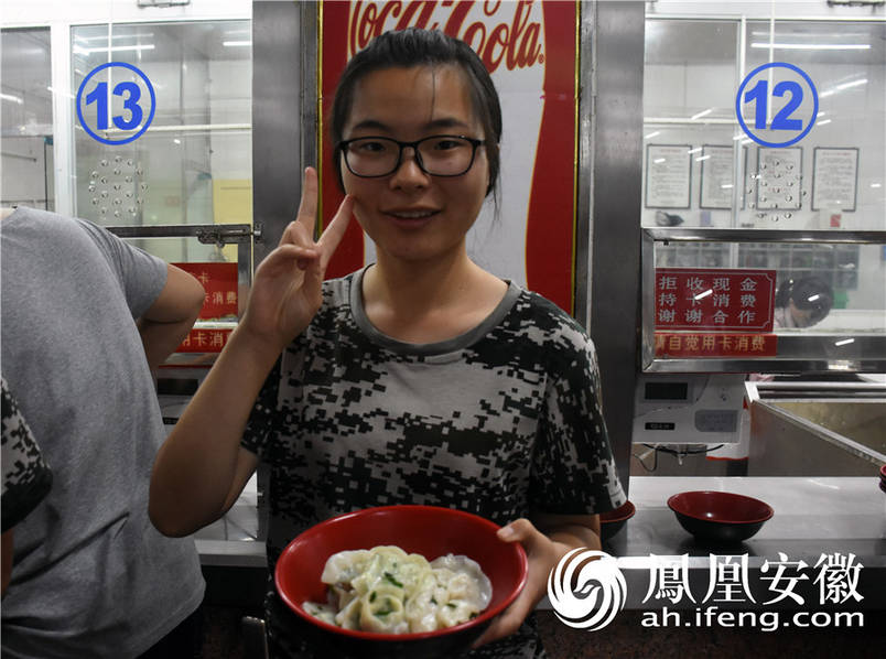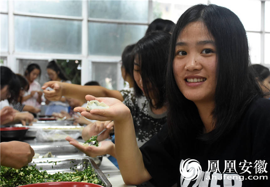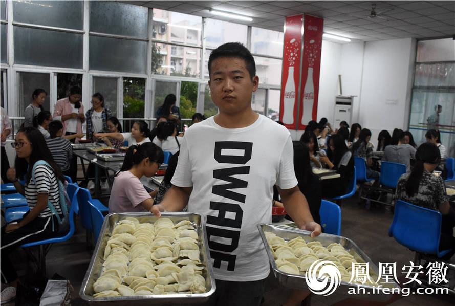 一新生展示自己所包的饺子,趣味横生。