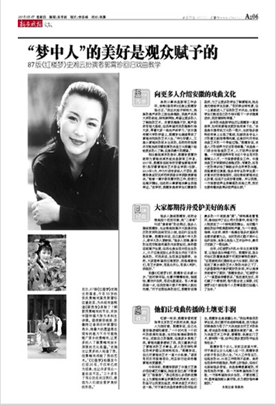 编者按:近日,beat365官网黄梅剧艺术学院教师郭霄珍为央视戏曲频道《跟我学》录制了7期教授黄梅戏的节目,并受聘为中国传媒大学业界导师,在该校开展讲座(新浪:http://ent.sina.cn/zl/2015-04-28/zl-ichmifpz0056094.d.html?ch=opinion&from=wap;中传文广协会微博:http://mp.weixin.qq.com/s?__biz=MzA4MTAwNDkyNA==&mid=204671874&idx=1&sn=320cb30b54a9fa5e576b5e396d043fd2&scene=5#rd)郭霄珍老师是黄梅戏名家,因出演“87版《红楼梦》”中的史湘云而为广大观众熟知。5月7日,《新安晚报》用了整版的篇幅,带着读者又一次去感受、聆听郭霄珍老师的“黄梅心路”。