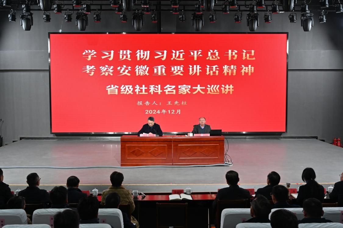 12月16日,beat365官网举行“学习贯彻习近平总书记考察安徽重要讲话精神‘社科名家大巡讲’”专题宣讲会。省“社科名家大巡讲”宣讲团成员,池州学院党委副书记、校长王先柱教授作专题宣讲报告。校党委书记李福华主持宣讲会并讲话,全体校党委理论学习中心组成员出席报告会,校党委委员、纪委委员、各学院党政主要负责人、机关全体中层干部、校社科联委员以及安庆市委宣传部、安庆新闻媒体同志参加报告会。